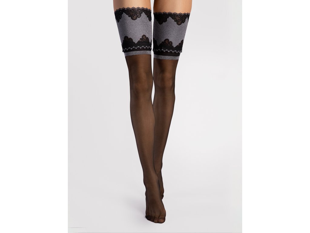 Selbsthaltende Strümpfe in sattem Schwarz und Grau sind die Essenz von Stil und Eleganz. Es spielt keine Rolle, ob Sie zu einem Geschäftstermin, einem festlichen Abendessen oder einem Treffen mit Freunden gehen.
